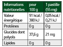 édulcorants : glycosides de steviol issus de stevia E960A, mannitol, bicarbonate de sodium, citrate monosodique, L-Leucine.